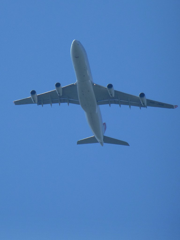 Airbus A340 der Swiss Air HB-JMB im Landeanflug auf den Flughafen Zürich, fotografiert in Hohentengen am Hochrhein, Juli 2013