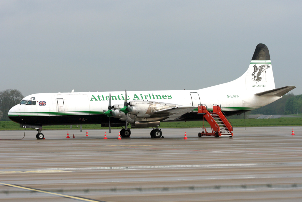 Atlantic Airlines Lockheed L-188 Electra G-LOFB verweilt auf dem Vorfeld in LGG / EBLG / Liege am 26.04.2009