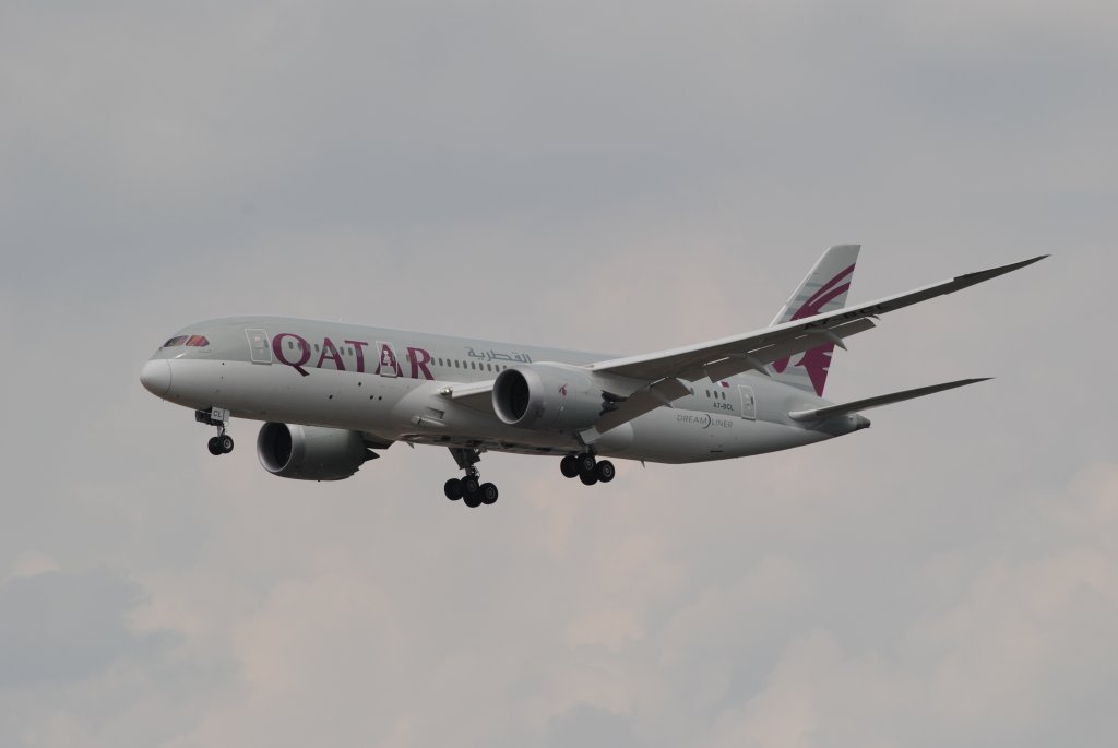 Eine Boeing 787 -Dreamliner-der Airline Quatar mit der Kennung A7-BFC im Anflug auf den Frankfurter Flughafen.