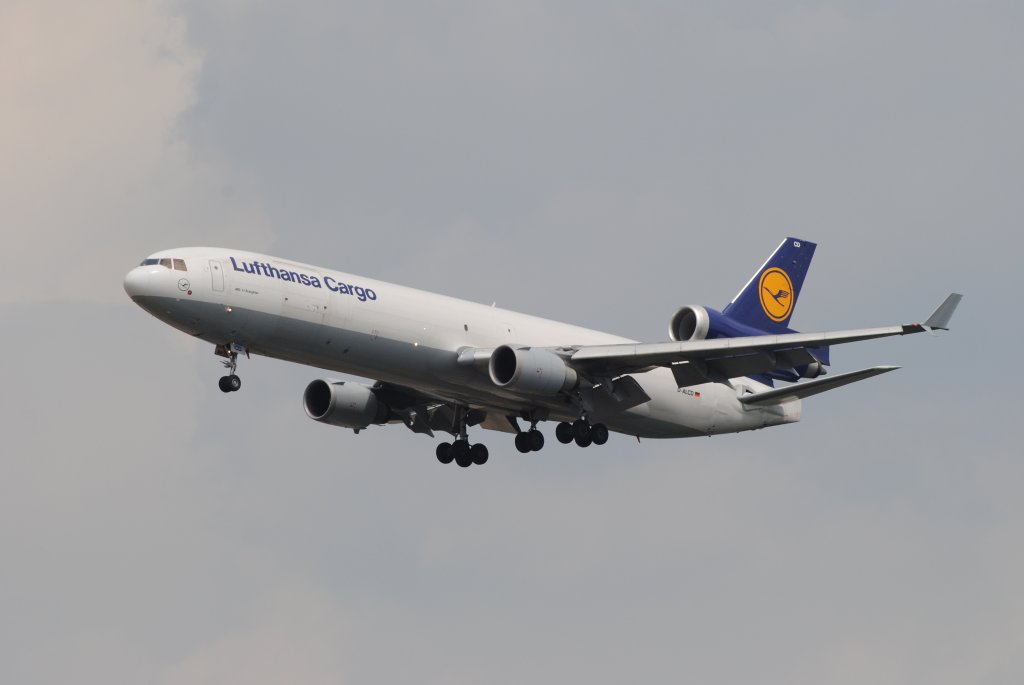 Eine McDonnell Douglas MD11f - Lufthansa Cargo-mit der Kennung D-ALCD im Anflug auf den Flughafen Frankfurt am Main(EDDF).