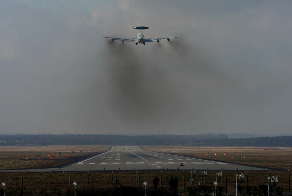 BMI B757-200 G-STRY kurz vor der Landung auf der 05R in DUS / EDDL / Düsseldorf am 28.12.2008