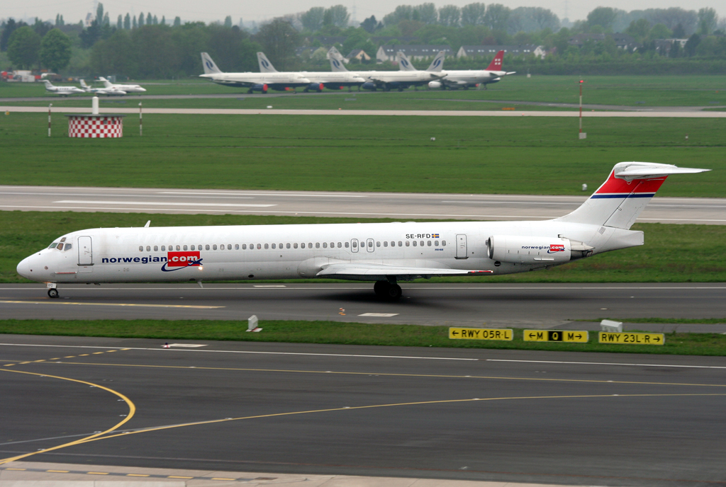 Norwegian MD82 SE-RFD verlässt die 23L in DUS / EDDL / Düsseldorf am 16.04.2009