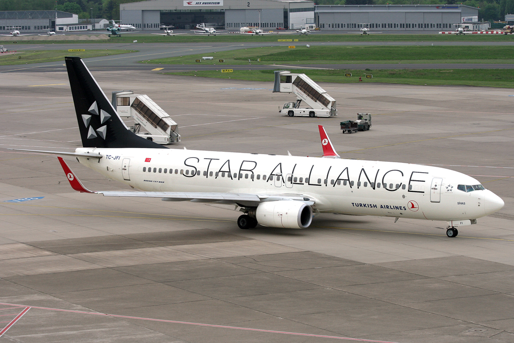 Turkish Star Alliance B737-800 TC-JFI rollt übers Vorfeld zur 23L in DUS / EDDL / Düsseldorf am 16.04.2009
