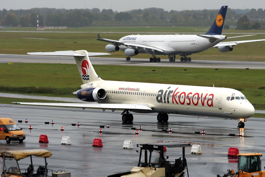 Air Kosova MD83 S5-ACC und Lufthansa A340-300 D-AIGO an der 23L in DUS / EDDL / Düsseldorf am 05.10.2008