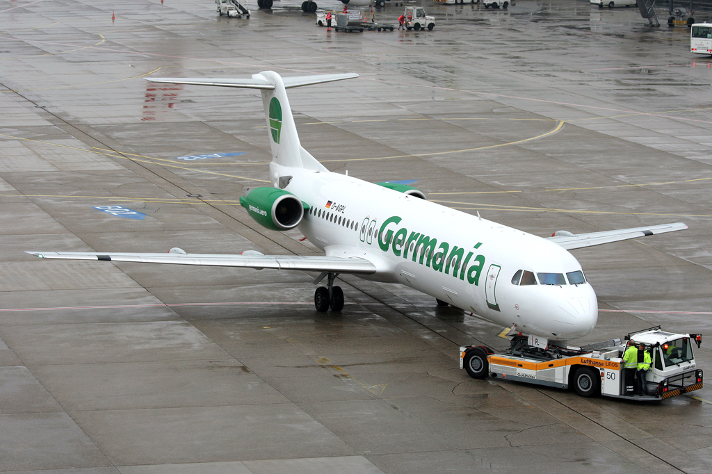 Germania F100 D-AGPL beim Pushback in DUS / EDDL / Düsseldorf am 08.10.2008