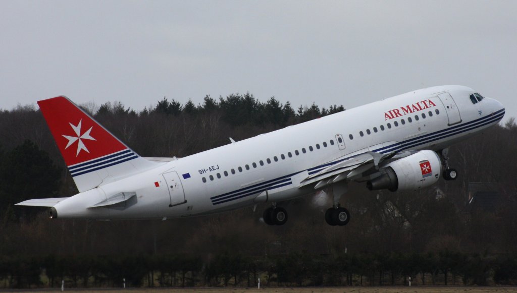 Der Air Malta Airbus A320-200 9H-AEO in einer Sonderlackierung der Hauptstadt Valletta beim Start in Hamburg Fuhlsbüttel am 27.02.13