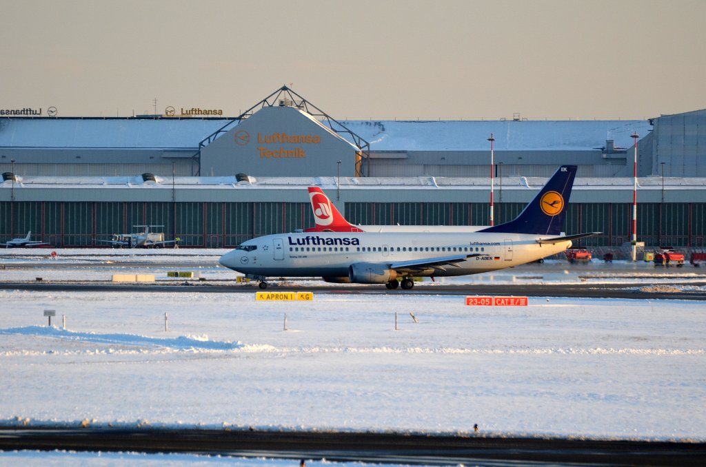 Die Lufthansa Boeing 737-300 D-ABEK rollt nach der Landung in Hamburg zum Gate aufgenommen am 12.03.13