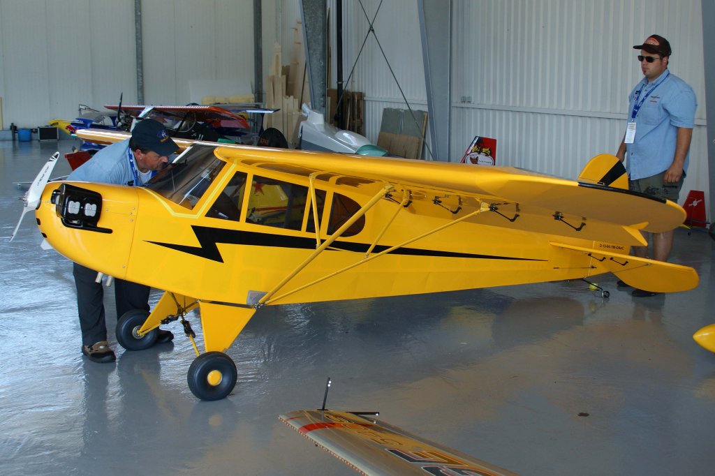 HB-OIA, Piper "J3C ~ Albatros", 40-Jahre Jubiläums-Airmeeting des DMFV (Deutscher Modellflieger Verband) auf dem Flugplatz der Fa. "GROB AIRCRAFT" am 07.07.20