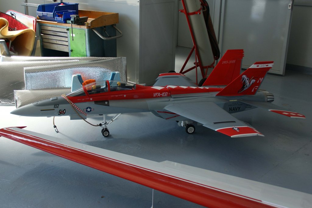 VFA-102 165882, McDonnell-Douglas "F/A-18 F Super Honet" (US Air Force), 40-Jahre Jubiläums-Airmeeting des DMFV (Deutscher Modellflieger Verband) auf dem Flugplatz der Fa. "GROB AIRCRAFT" am 07.07.20