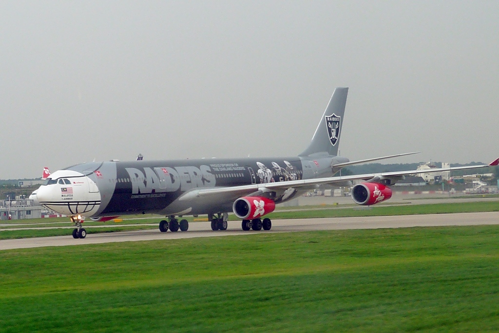 Air Asia X Airbus 340, 9M-XAC, in den Farben der Oakland Raiders in Steansted, 6.9.10