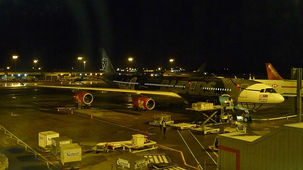 Air Asia X Airbus 340, 9M-XAC, in den Farben der Oakland Raiders in Steansted, 17.12.10