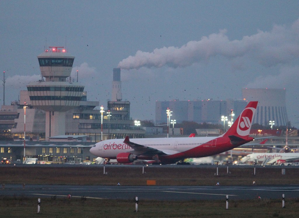 Air Berlin A 330-223 D-ABXB bei der Ankunft in Berlin-Tegel am frühen Morgen des 10.11.2012