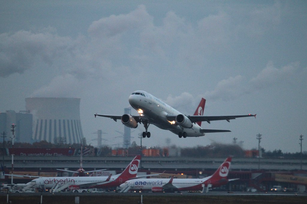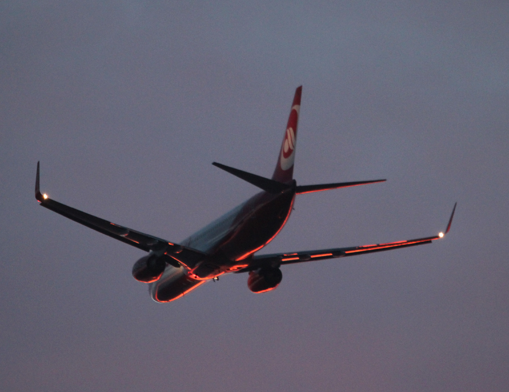Air Berlin B 737-86J D-ABKM beim Start in Berlin-Tegel am frühen Morgen des 10.11.2012