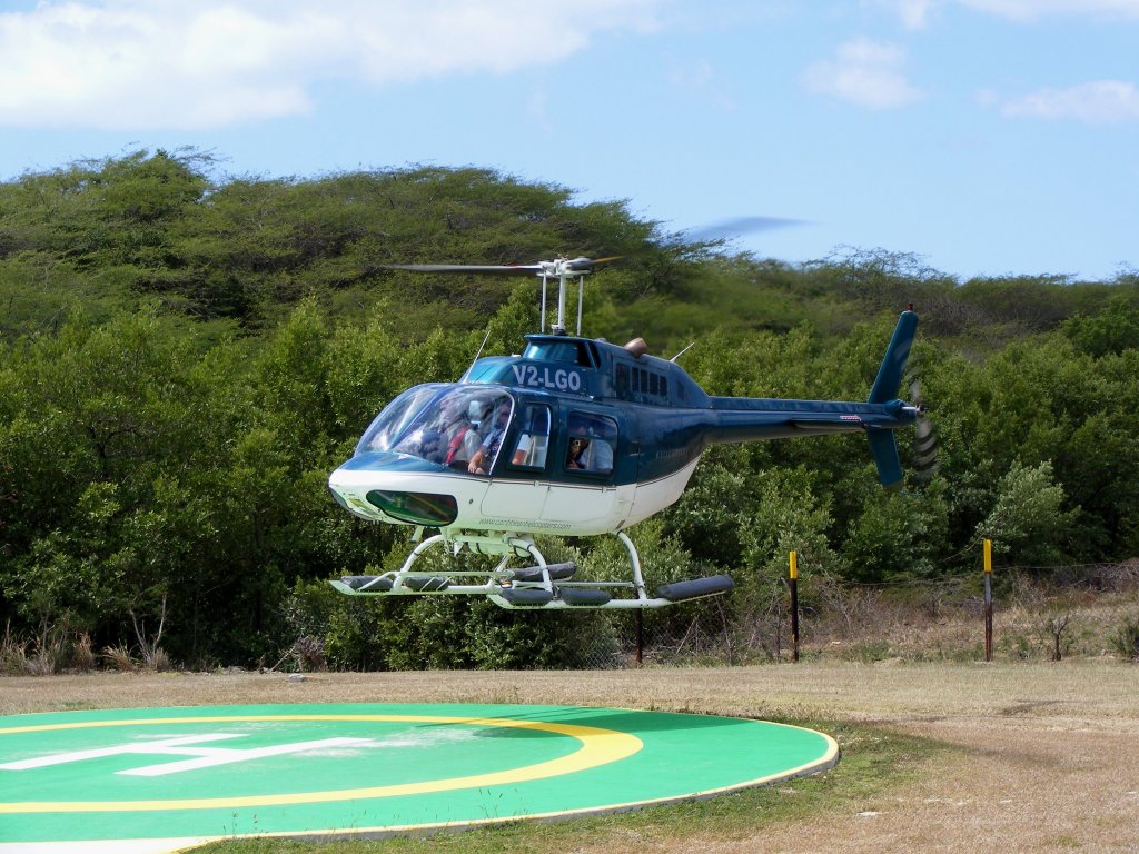 Bell 206B Jet Ranger V2-LGO bei der Landung auf Antigua am 4.3.2013