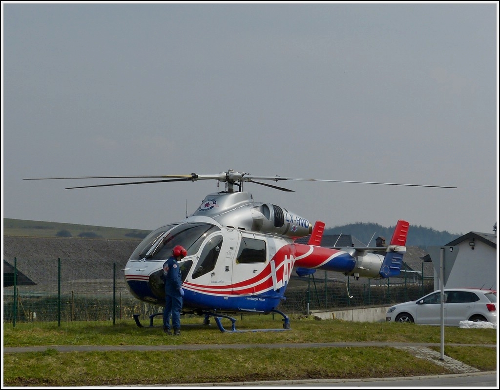 LX-HMD (McDonnell Douglas MD-900 Explorer), wärend die Rotoren des Hubschraubers der Luxemburgischen Rettungsflugwacht sich drehen, horcht der Pilot noch kurz ob die Motoren normal laufen bevor er einsteigt und nach kurzer Zeit mit dem Hubschrauber abhebt und davon fliegt. 28.03.2012