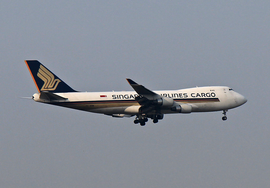 747Freighter, 9V-SFM, der Singapore Airlines Cargo im Landeanflug auf Leipzig-Halle, 30.03.2014