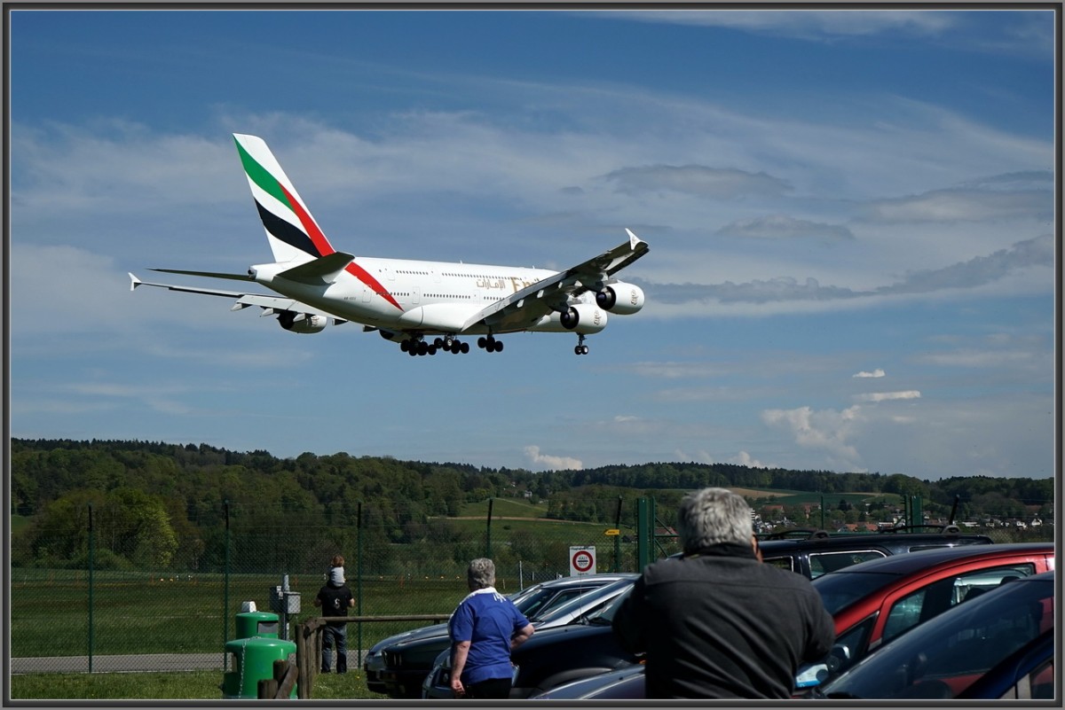 Emirates, A6-EEU, Airbus A380-861. Der grosse Airbus lockt jeden Tag viele Schaulustige zur Runway 14 an und jede Menge Fotos werden gemacht. Vielen reicht auch ein Smartphone zum Fotografieren, ich mache meine Bilder nur mit einer richtigen Kamera. Zürich,24.4.2014.