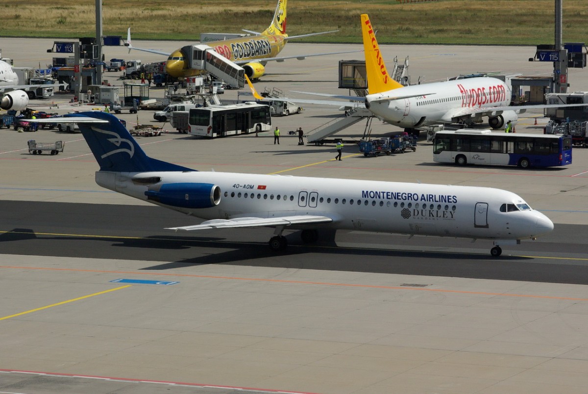 4O-AOM Montenegro Airlines Fokker F100 zum Start am 16.07.2014 in Frankfurt