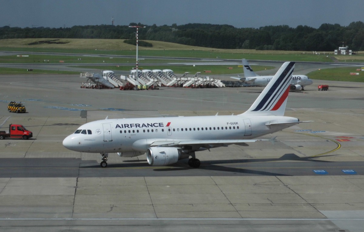 Ein Airbus A 318-100 der Air France mit der Kennung F-GUGK auf dem Hamburg Airport am 19.07.14