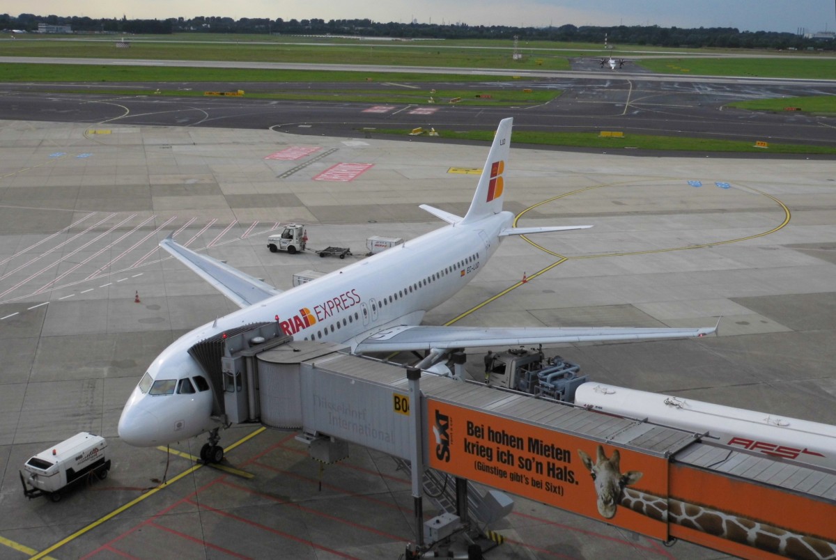 Einer von 15 Airbus A 320-200 (Kennung: EC-LUD) der 2011 gegründeten spanischen Billigfluggesellschaft Iberia Express am 24.7.14 auf dem Düsseldorfer Flughafen