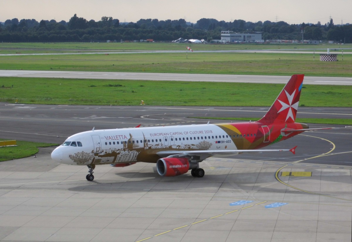 Einer von (noch) 6 Airbus A 320-200 9H-AEO der Air Malta in Valetta-Sonderlackierung am 24.7.14 am Düsseldorfer Flughafen