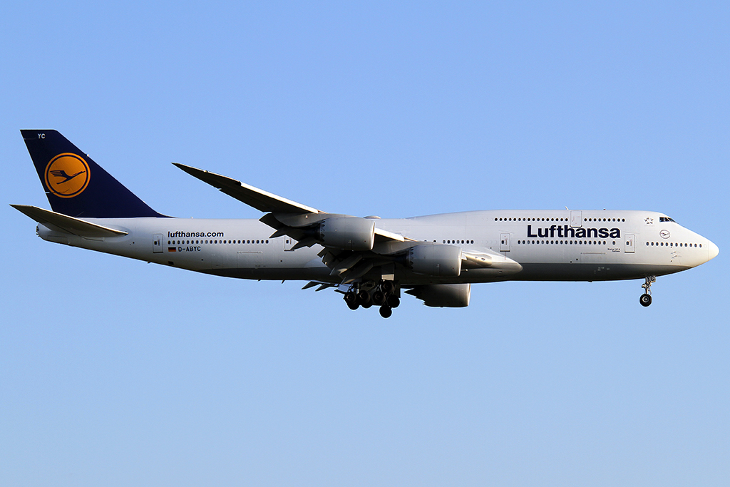 Lufthansa 747 8i Reg.: D-ABYN) im Anflug auf die RWY 07R in FRA am 08.08.2014