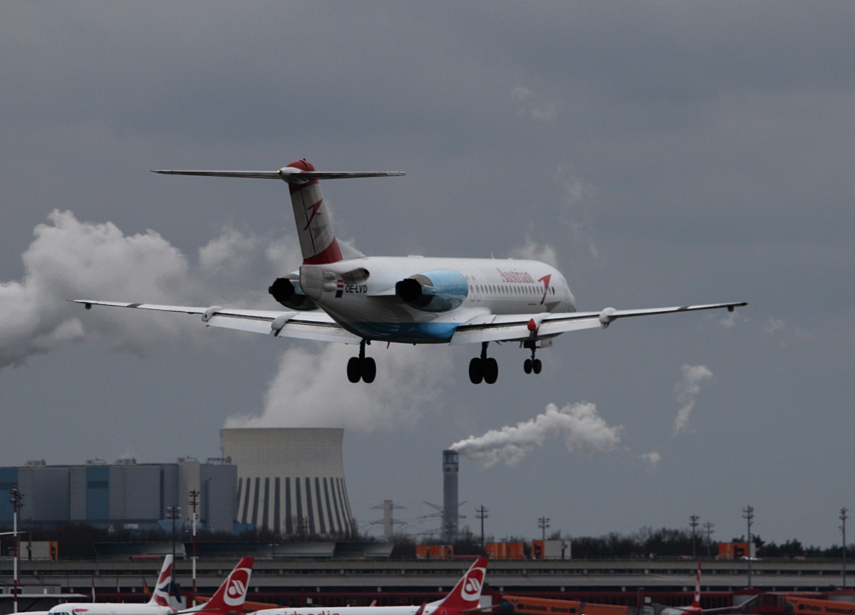 Austrian Airlines Fokker 100 OE-LVD bei der Landung in Berlin-Tegel am 13.02.2014