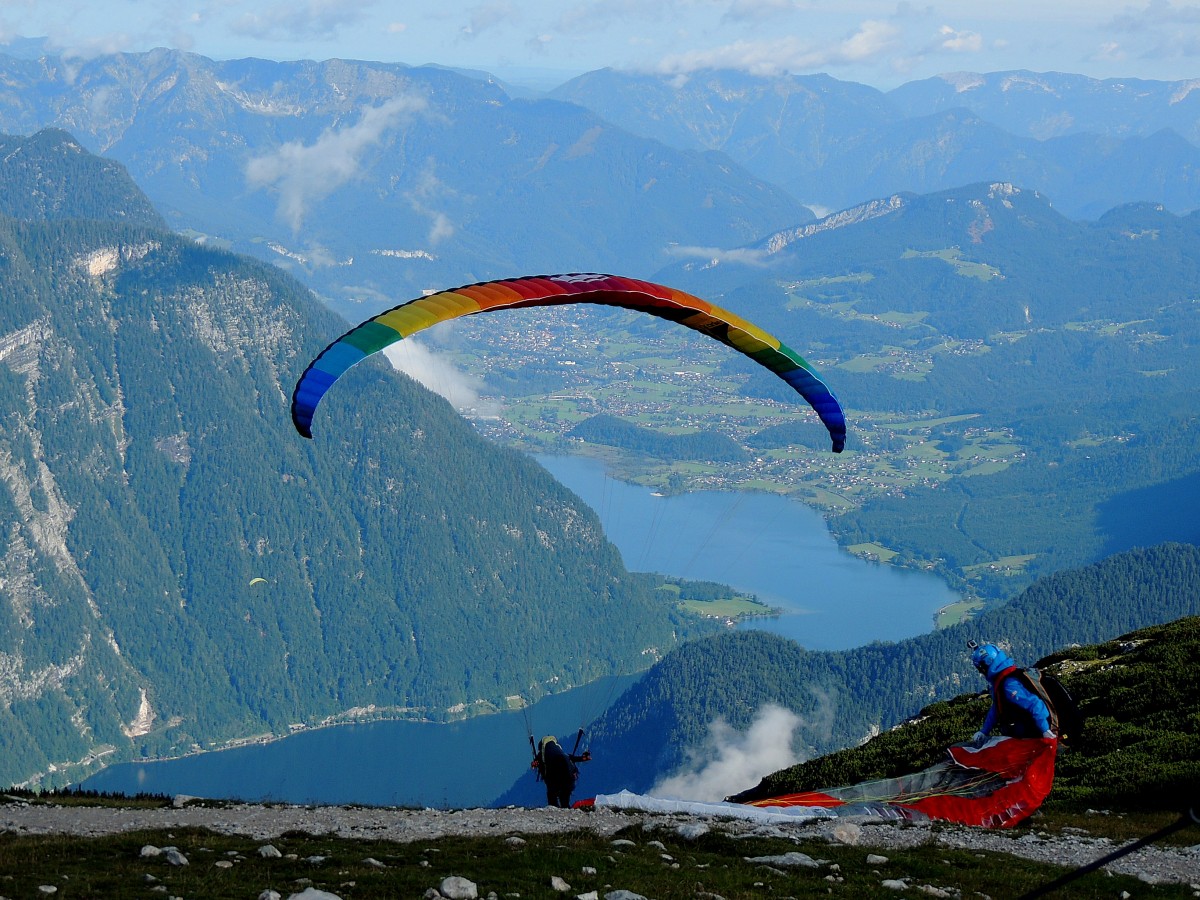 Paragleiter starten nahezu im Minutentakt vom rd. 2070mtr. hohen Krippenstein, im Dachsteinmassiv, hinunter Richtung Hallstättersee; 140817