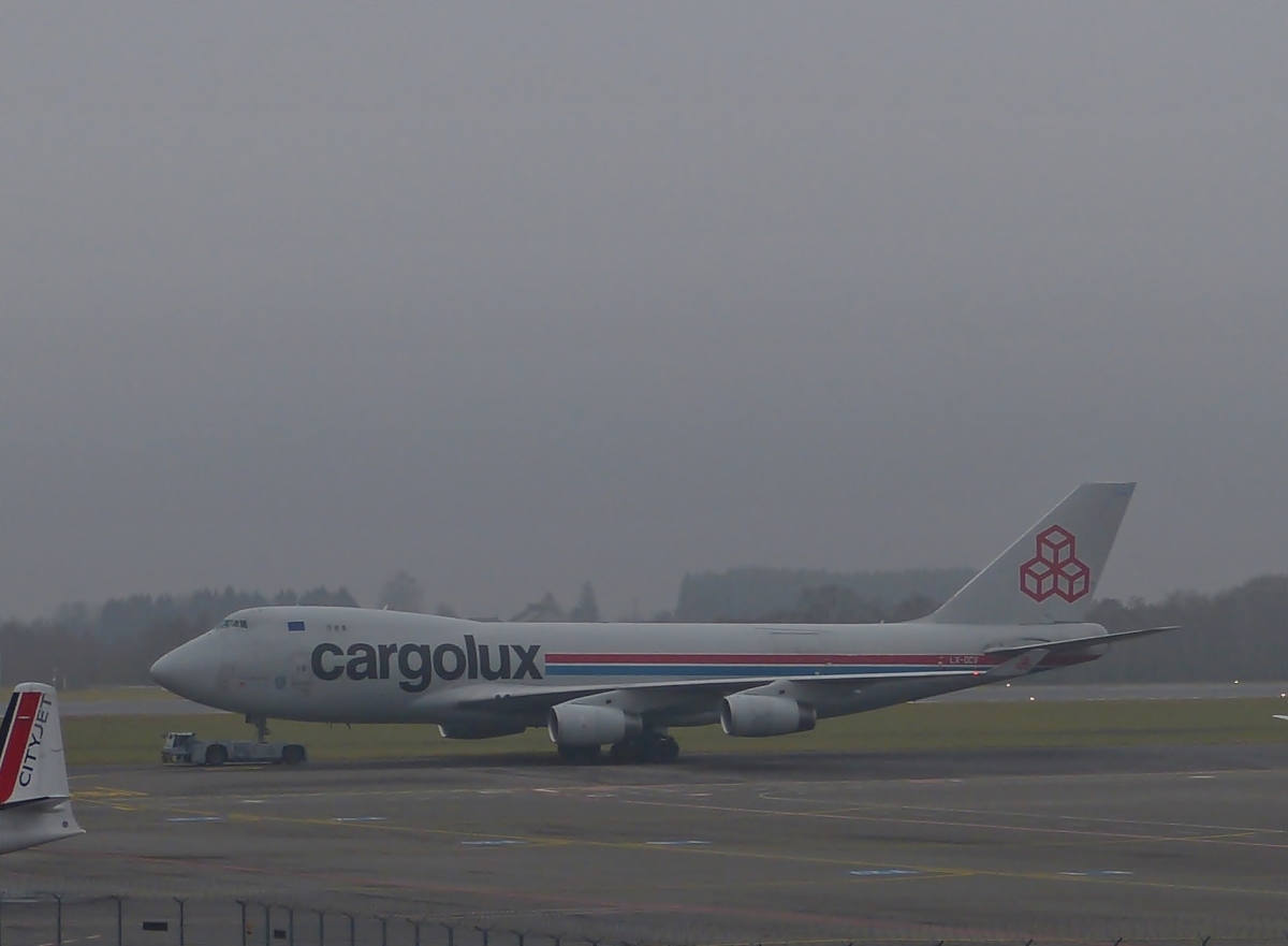 Die Cargolux Boeing 747-4B5 LX-DCV wird am 22.01.2014, bei neblig trübem Wetter, über das Vorfeld des Flughafens von Luxemburg geschleppt.