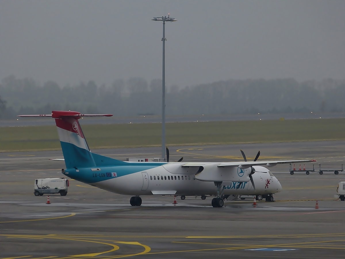 Luxair De Havilland Canada DHC-8-402Q. LX-LGF, aufgenommen kurz vor dem Start in Luxemburg. 22.01.2014