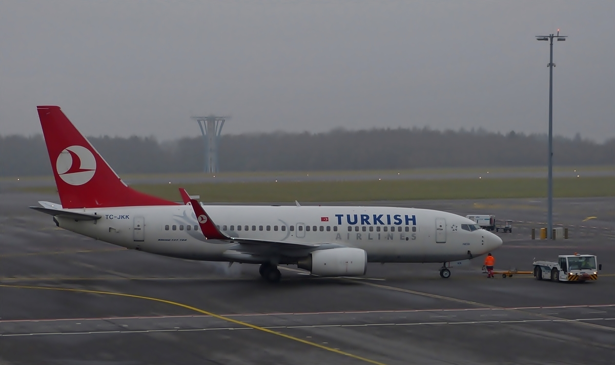 TC-JKK Turkish Airlines Boeing 737-752, wurde vom Gate aufs Rollfeld des Flughafens von Luxemburg geschoben wo nun die Turbinen gestartet werden. 22.01.2014