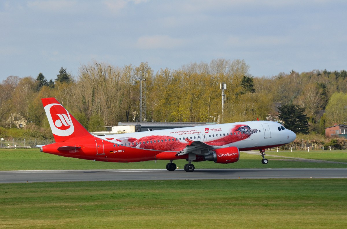 Air Berlin Airbus A320 D-ABNE über Hamburg Poppenbüttel im Anflug auf Fuhlsbüttel am 12.04.15