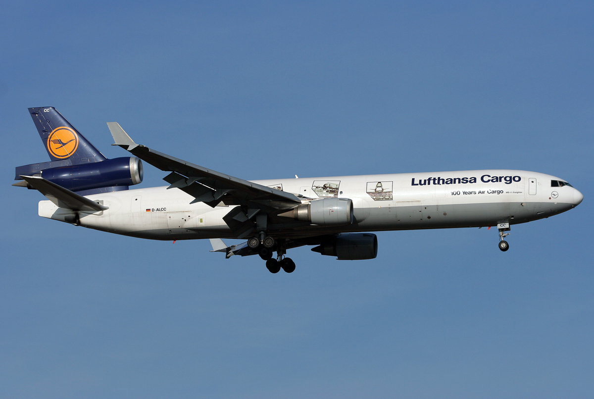 100 Years Lufthansa Cargo MD-11F D-ALCC im Anflug auf 25R in FRA / EDDF / Frankfurt am 13.11.2011