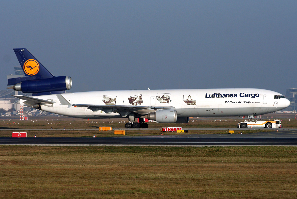 100 Years Lufthansa Cargo MD-11F D-ALCC gezogen auf dem taxiway zur Cargoplatte in FRA / EDDF / Frankfurt am 13.11.2011