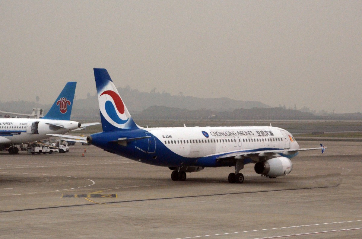 Airbus A 320 B-2346 von Chongqing Airlines auf dem Flughafen von XI‘AN zum Start bereit. Beobachtet am 23.10.2014.
