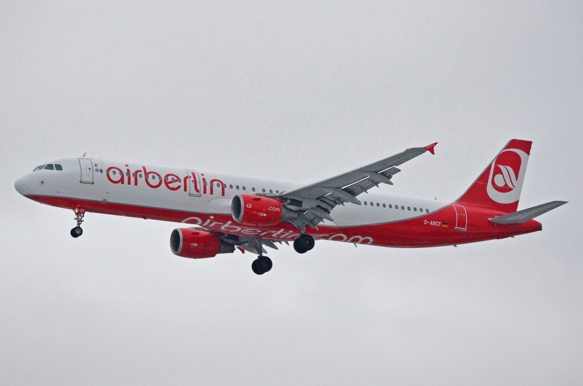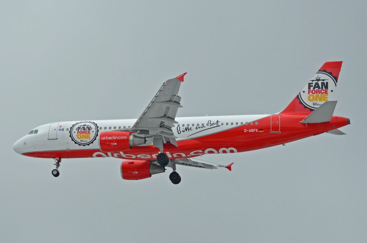 D-ABFK Air Berlin Airbus A320-214 "Bitburger Fan Force One" , in Tegel beim Anflug am 04.02.2015