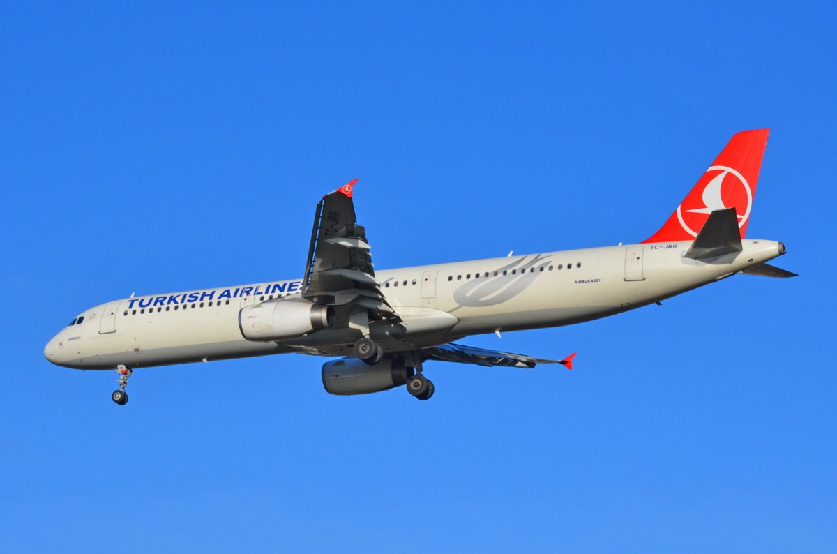 Airbus A321 (TC-JSK) der Turkish-Airlines am 07.02.2015 im Landeanflug auf Leipzig-Halle.