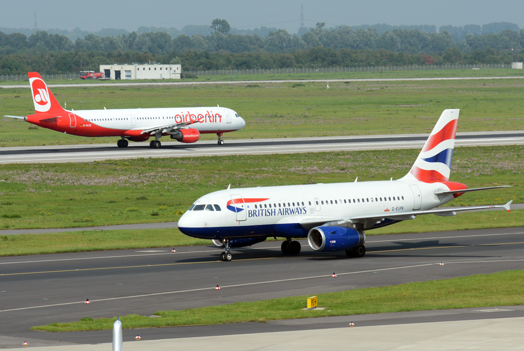 A 319-131 British Airways G-EUPK und auf der Startbahn die A 321-211 D-ALSC der Air Berlin in Düsseldorf - 04.09.2014