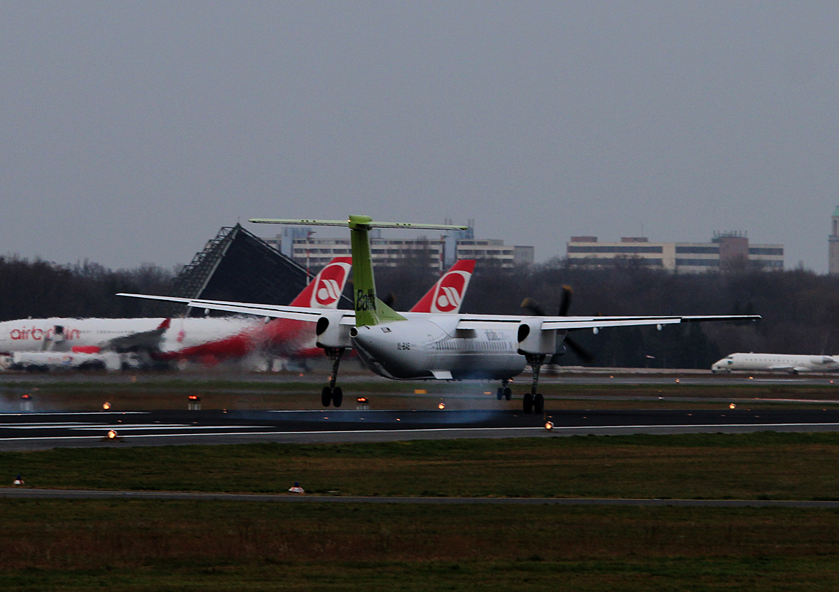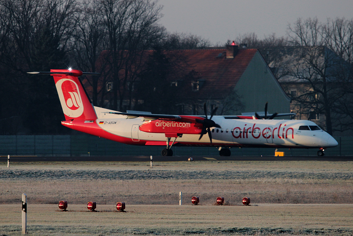 Air Berlin DHC-8-402Q D-ABQA bei der Landung in Berlin-Tegel am 18.01.2015