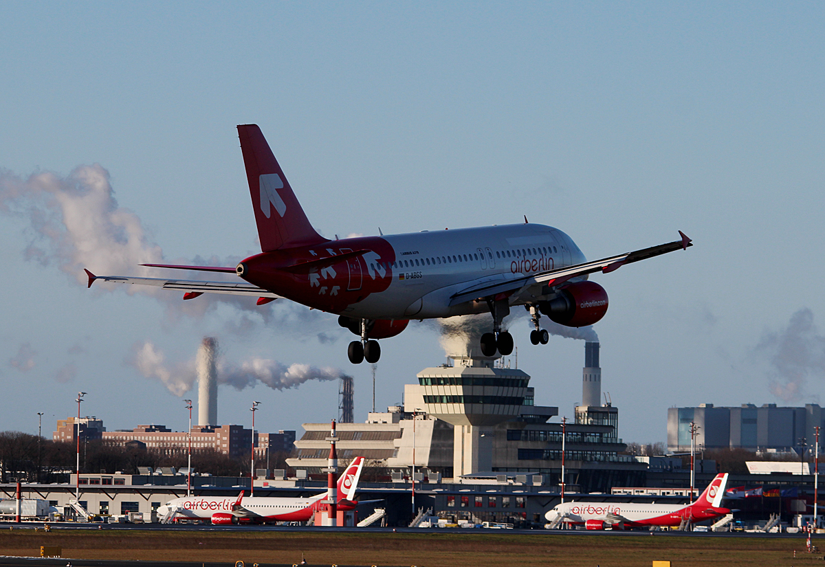 Air Berlin A 319-112 D-ABGS bei der Landung in Berlin-Tegel am 08.02.2015