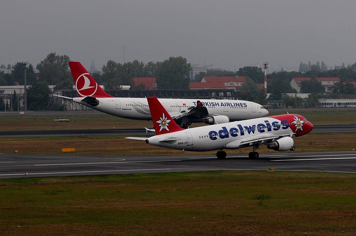 Edelweiss Air A 320-214 HB-IJV beim Start in Berlin-Tegel am 13.09.2014, im Hintergrund Turkish Airlines A 330-202 TC-JIN