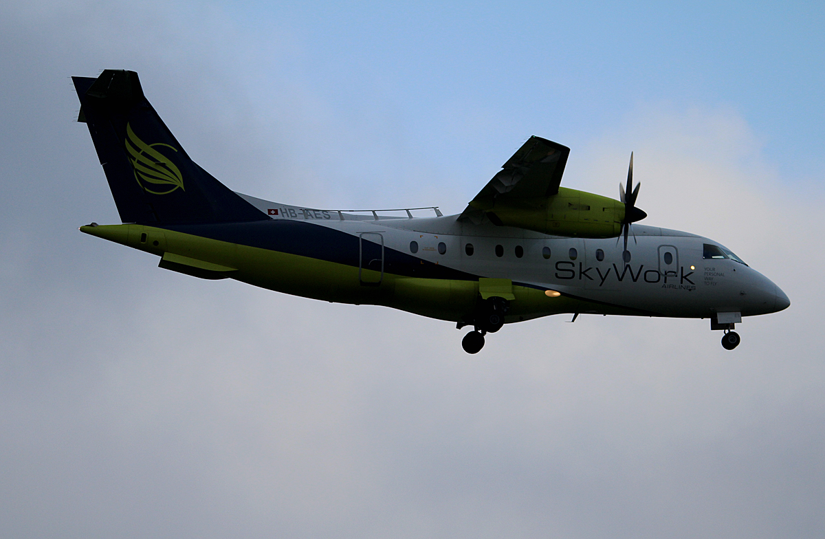 SkyWork Airlines Do-328-110 HB-AES bei der Landung in Berlin-Tegel am 27.09.2014