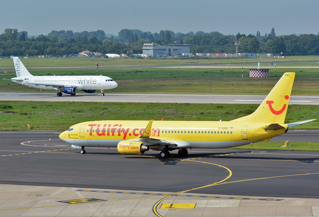 Im Vordergrund B 737-800 D-AHFH TUIfly und auf der Startbahn in Düsseldorf die A 320-214 White, CS-TRO - 04.09.2014