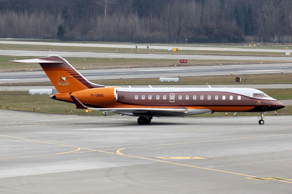 Private Bombardier BD-700-1A10 Global Express XRS M-UNIS rollt zum Start in Zürich 23.1.2015