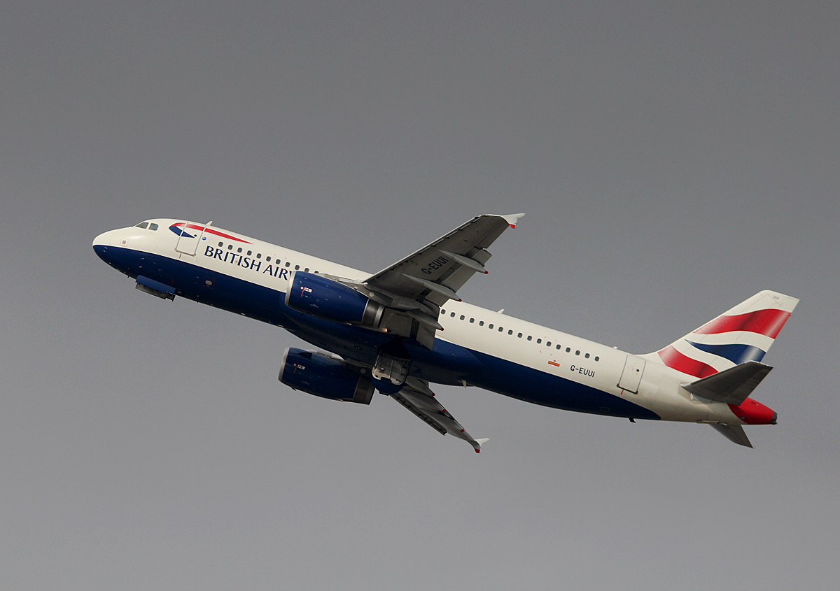 British Airways A 320-232 G-EUUI beim Start in Düsseldorf am 10.03.2015