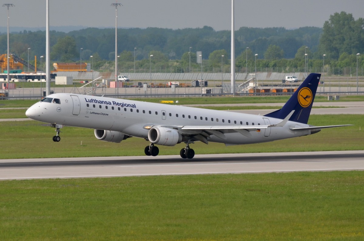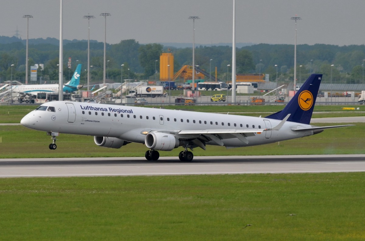 D-AEBA Lufthansa CityLine Embraer ERJ-195LR (ERJ-190-200 LR) bei der Landung in München 14.05.2015