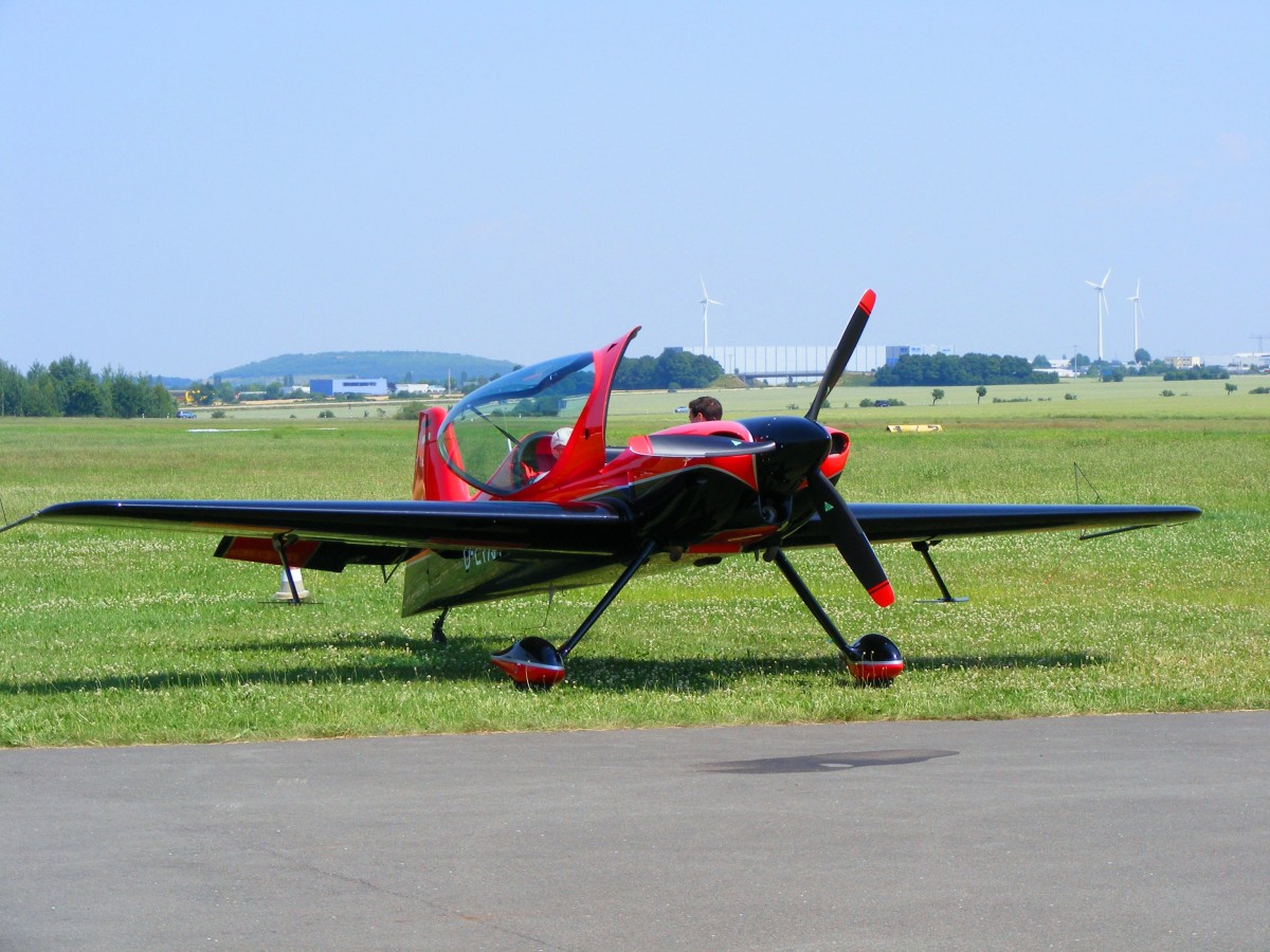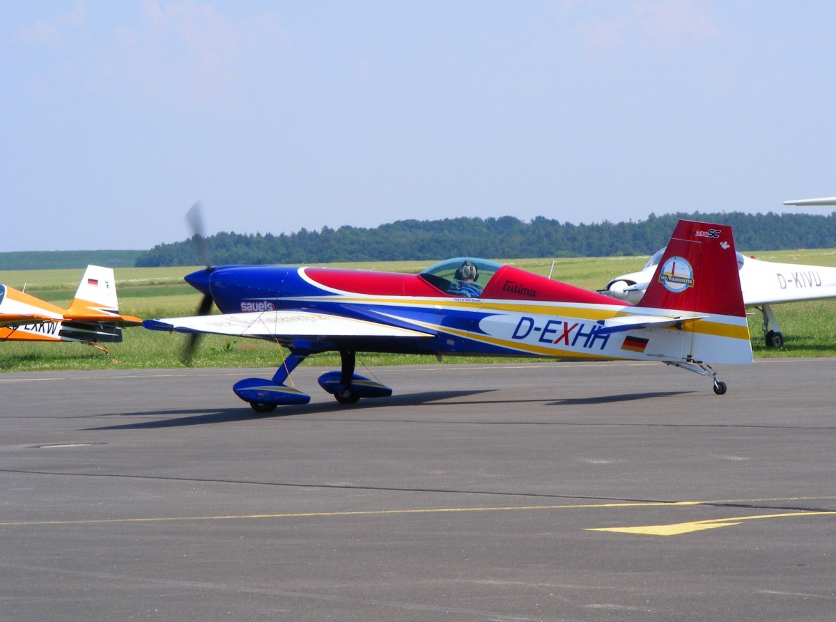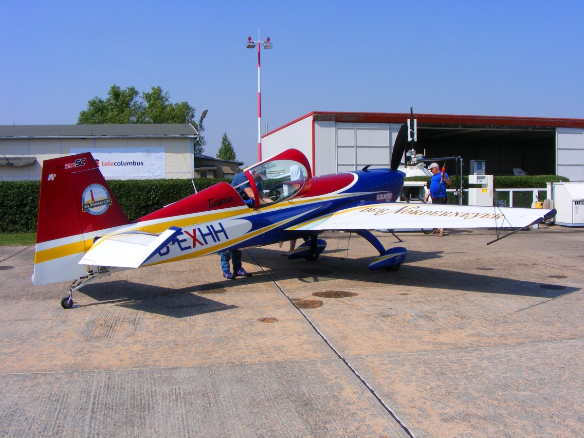 D-EXHH, Extra 330SC, gestartet in Gera (EDAJ), zum Wettbewerb um die Deutsche Meisterschaft im Motorkunstflug am 4.7.2015. Im Cockpit der neue Deutsche Meister in der Unlimetid Klasse Hein Sauels.