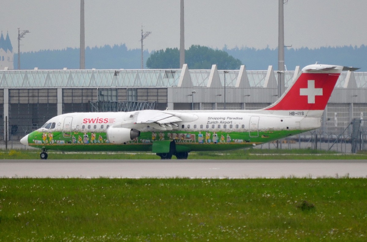 HB-IYS Swiss British Aerospace Avro RJ100 zum Start in München am 15.05.2015