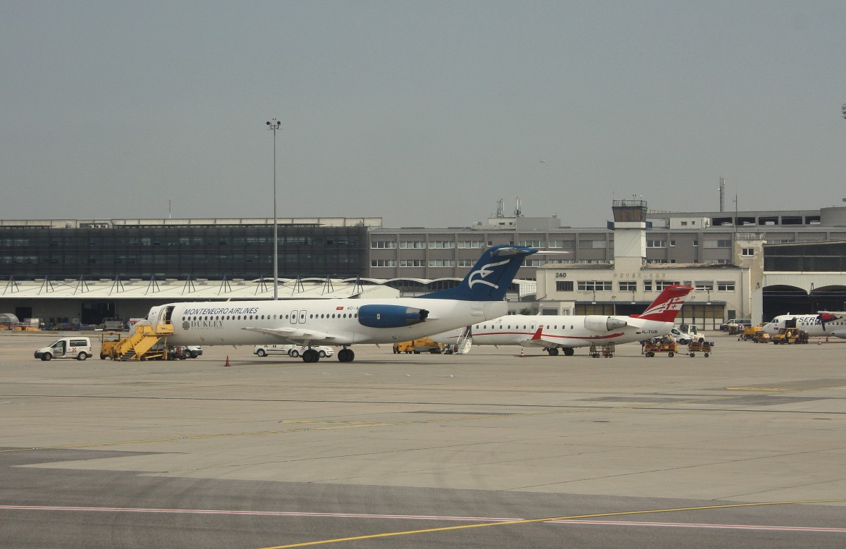 Montenegro Airlines, 40-AOP,(c/n 11332),Fokker F -100,02.07.2015, VIE-LOWW, Wien-Schwechat, Österreich (hinten:Airzena Georgian Airways, 4L-TGB, CRJ -200LR)