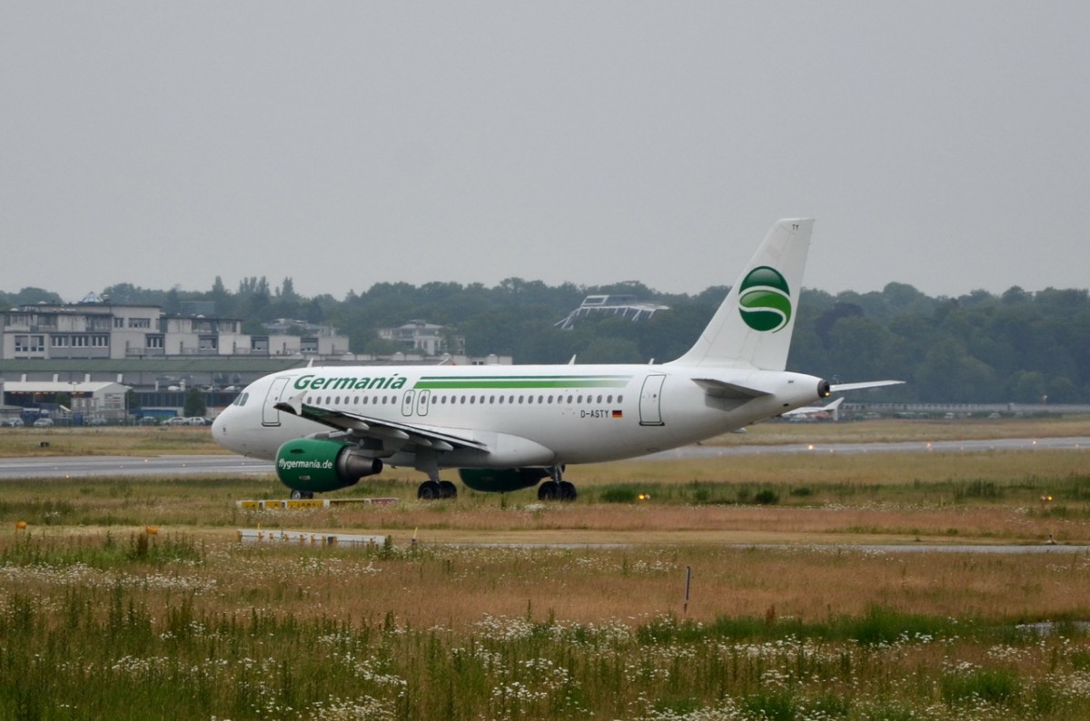 D-ASTY Germania Airbus A319-112 am 17.06.2015 zum Start in H.-Finkenwerder